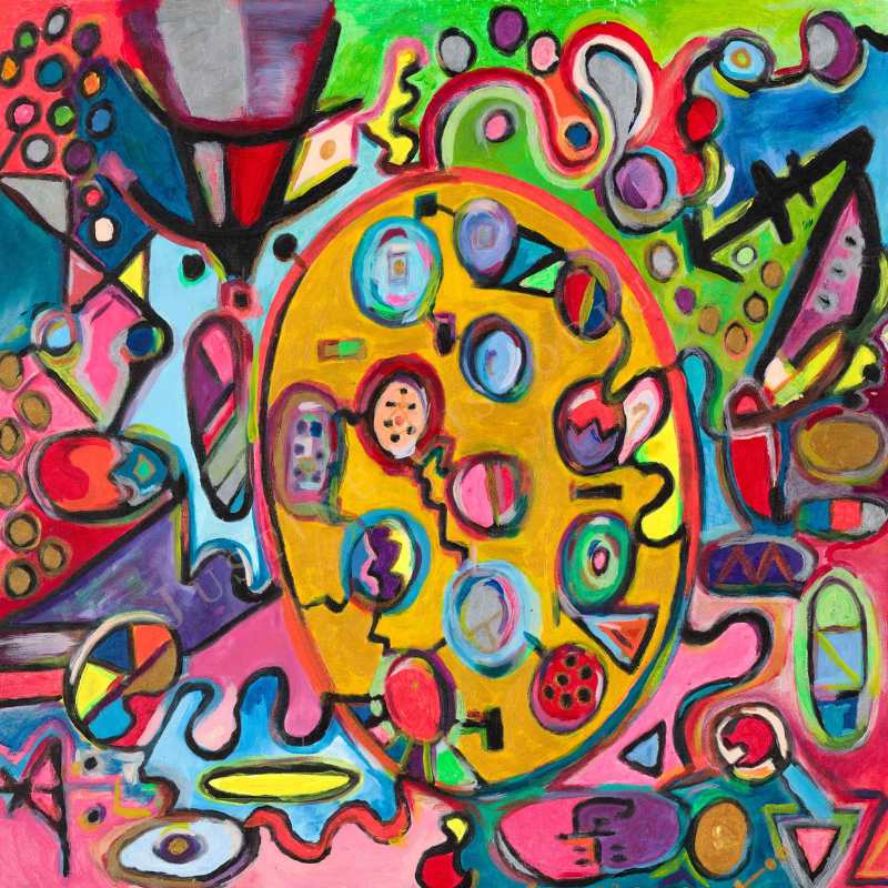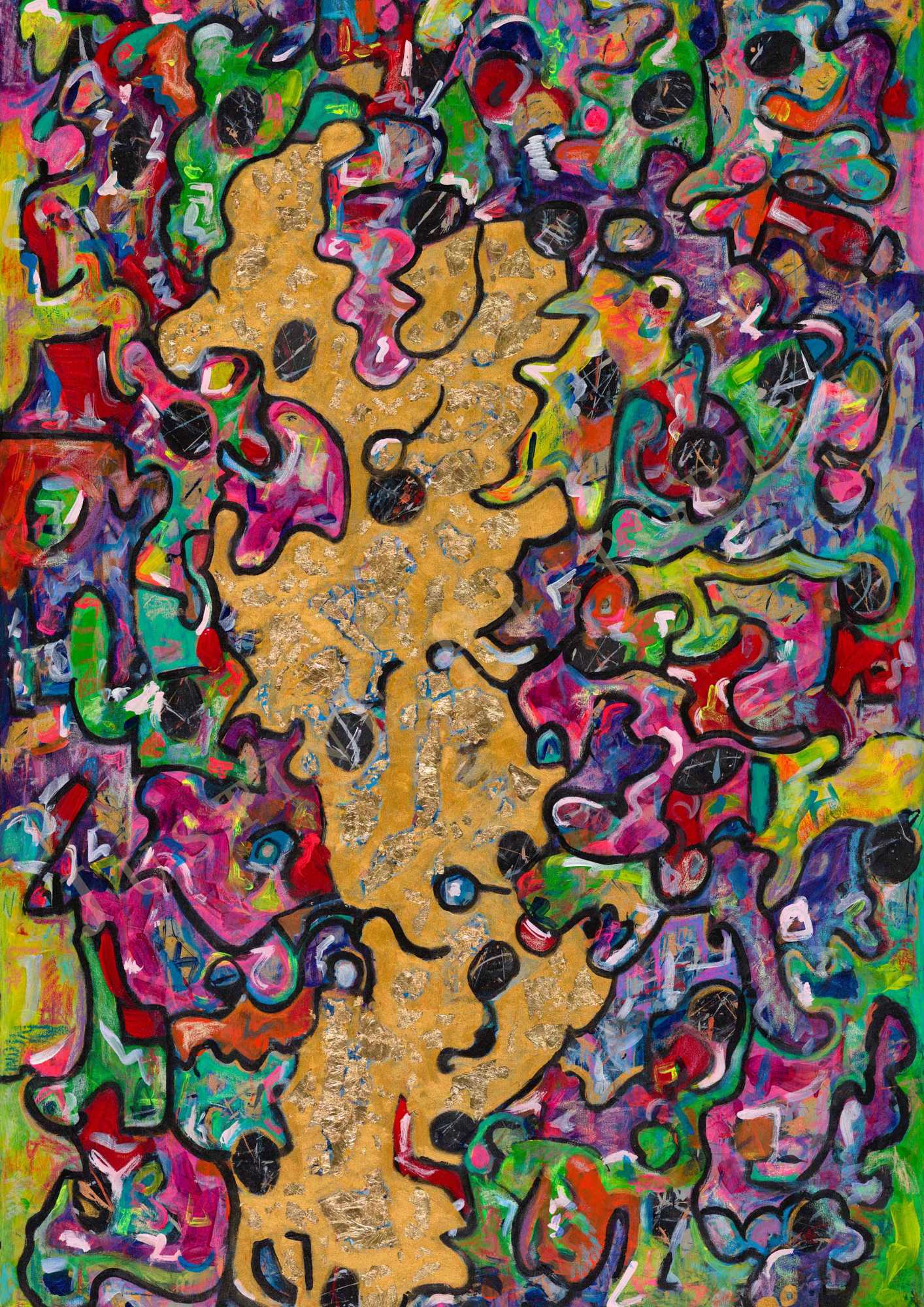 The activity of experience. Symbolically we start to identify recognisable symbols of figurative shapes. Expressing the rich experience of how we have developed into who we are, are the memories of the past that enrich the moments and understanding of the present. The action and activity is conveying how many lives we have had and gives us a sense of the layered time. The connection between these lives permeates the individual and create who we are in the moment of time